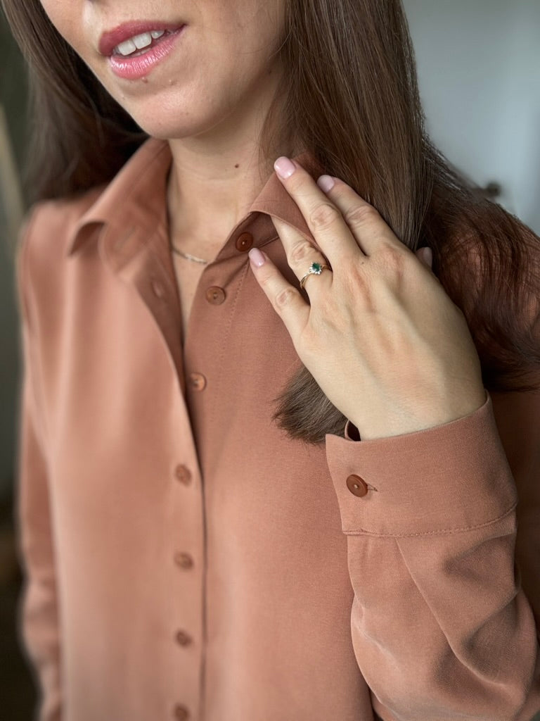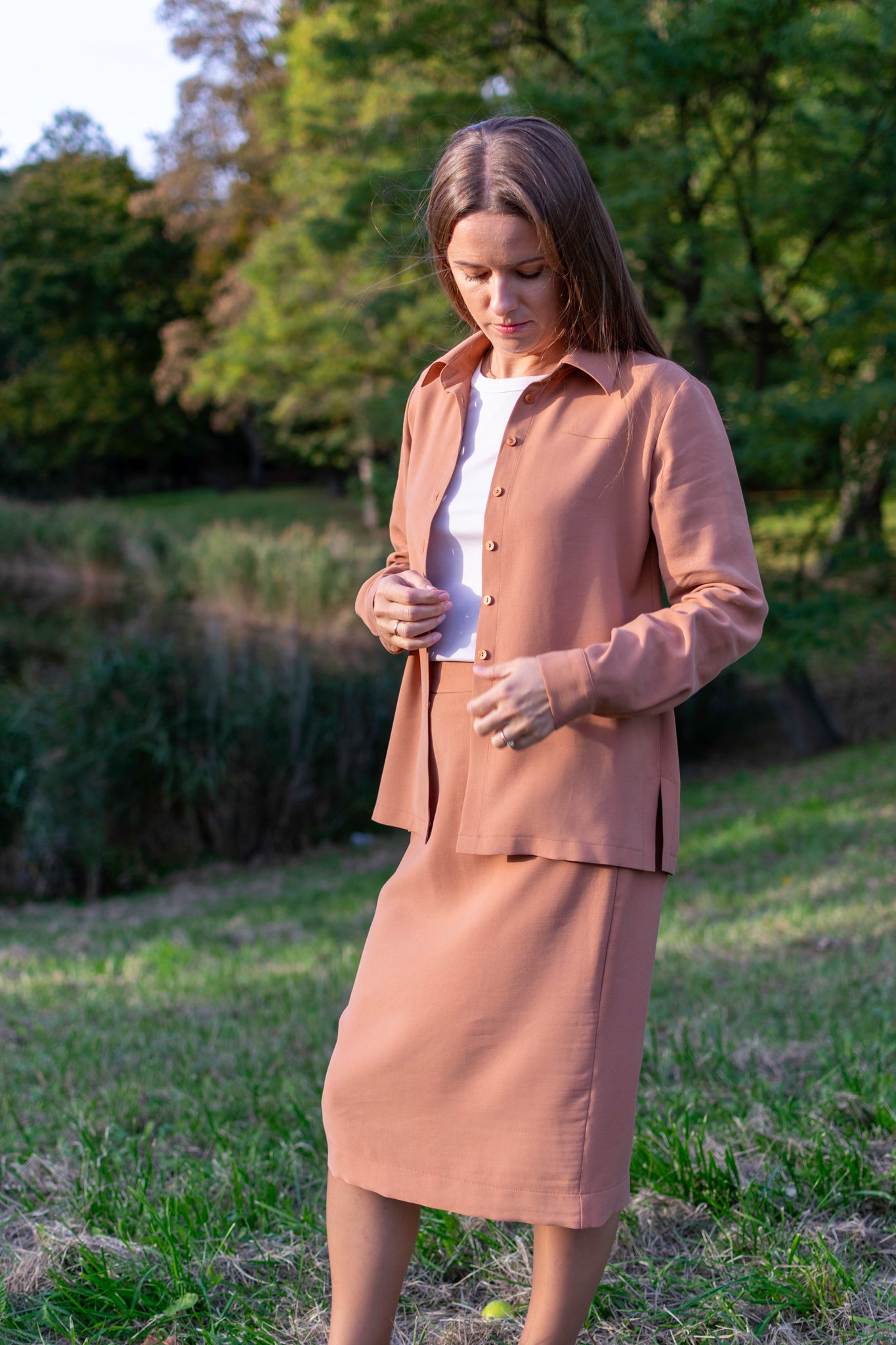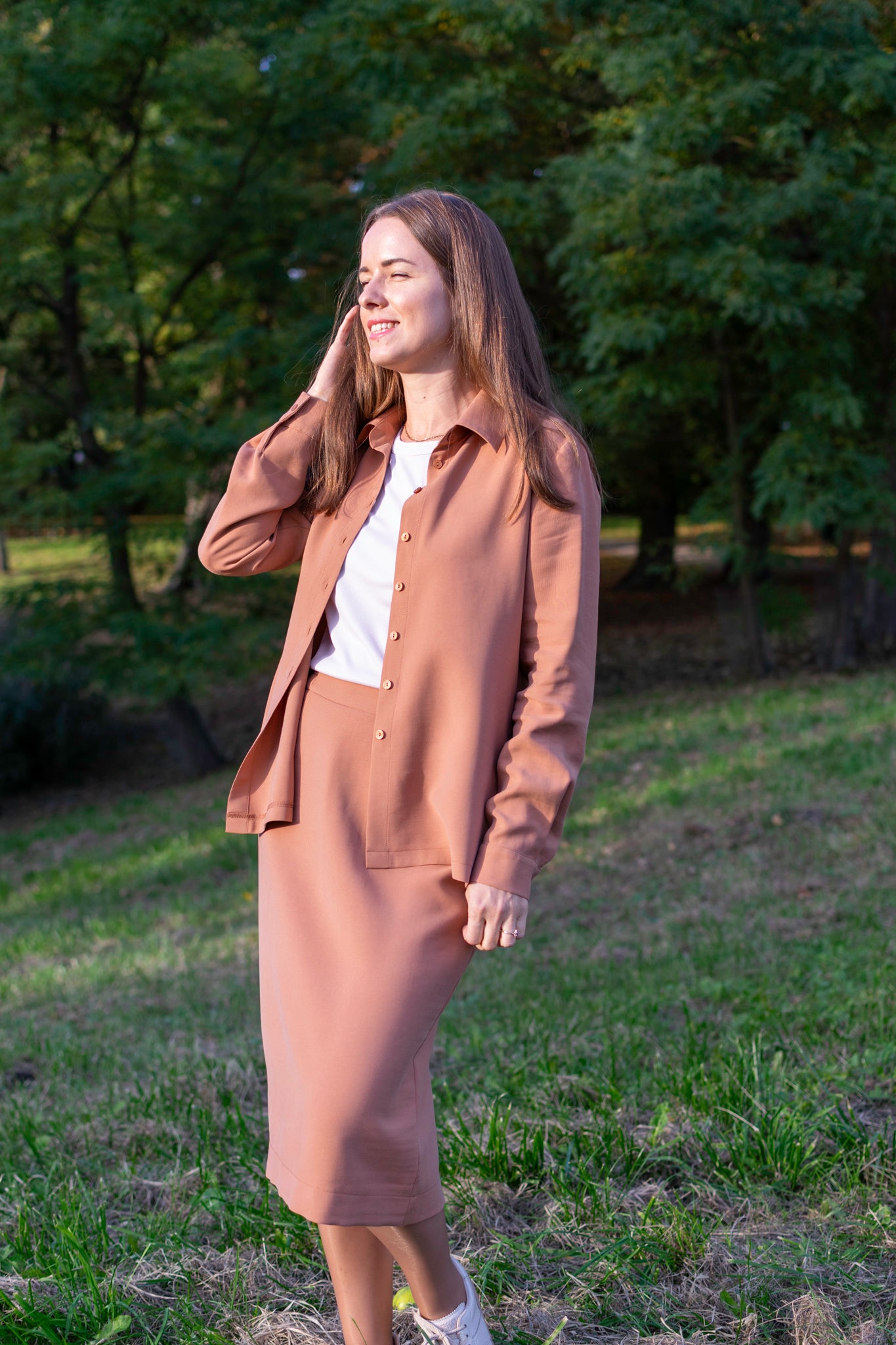 To nie była zwykła koszula. Gaja czekała na wieszaku, aby w końcu stać się częścią dnia kobiety, która wybiera styl, wygodę i odrobinę indywidualności. Rano Gaja delikatnie otula ramiona miękkim rękawem, a pod palcami sunie rząd guzików – zapięcie, które decyduje o tym, jaki ten poranek będzie. Spokojna siła tkaniny daje poczucie lekkości i swobody, pozwala oddychać, podąża za ruchem i myślą. W pracy Gaja jest dyskretna, elegancka – niezauważalna, choć obecna. Wieczorem staje się wyrazem swobodnego stylu, otula ciepłem. Ta koszula to codzienne spotkanie z czymś przyjaznym i naturalnym. Gaja nie narzuca się, a jednak pozwala poczuć się pewnie, niezależnie od chwili i miejsca. Po prostu – jest z Tobą wtedy, gdy chcesz być sobą.