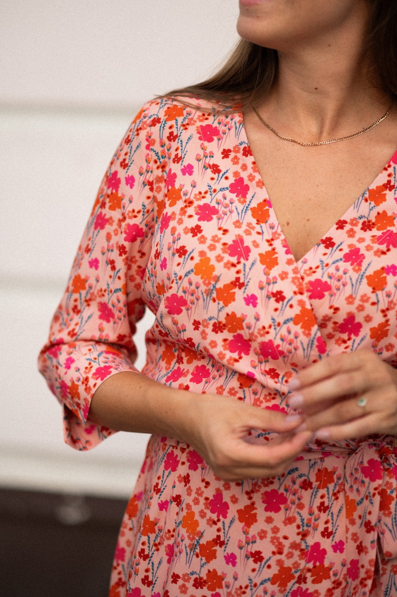 Sukienka posiada klasyczny kopertowy krój z dekoltem w kształcie litery „V”, który optycznie wydłuża szuję i subtelnie eksponuje biust. Dzięki wiązaniu w talii możesz idealnie dopasować fason do swojej sylwetki, podkreślając atuty i maskując ewentualne niedoskonałości. Dodatkowe zapięcie na napkę zapewnia komfort i pewność noszenia w każdej sytuacji.