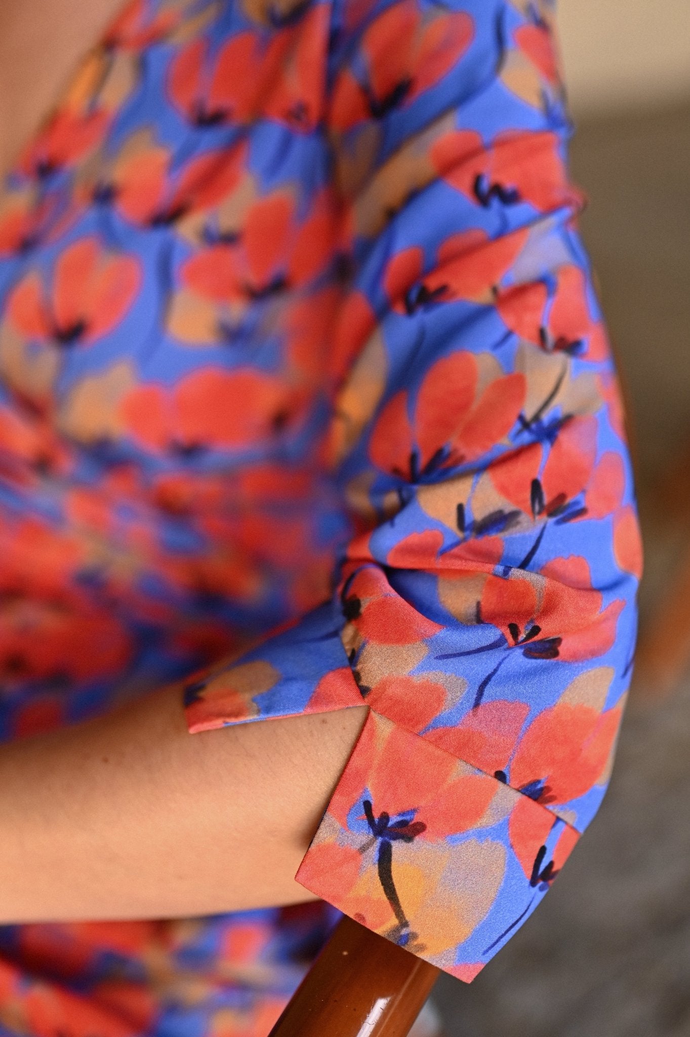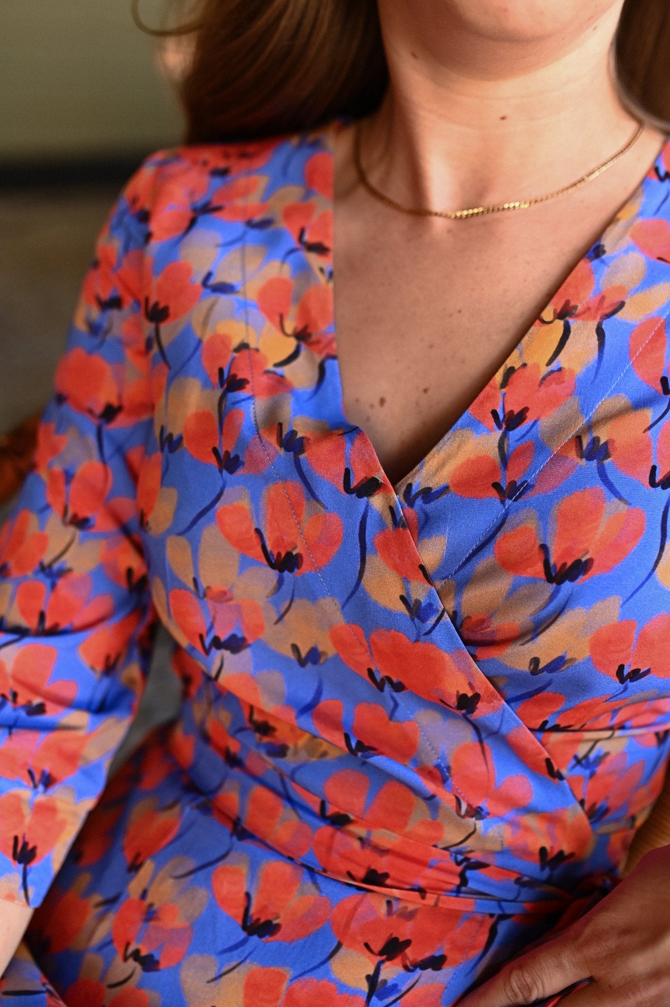 Sukienka posiada klasyczny kopertowy krój z dekoltem w kształcie litery „V”, który optycznie wydłuża szuję i subtelnie eksponuje biust. Dzięki wiązaniu w talii możesz idealnie dopasować fason do swojej sylwetki, podkreślając atuty i maskując ewentualne niedoskonałości. Dodatkowe zapięcie na napkę zapewnia komfort i pewność noszenia w każdej sytuacji.